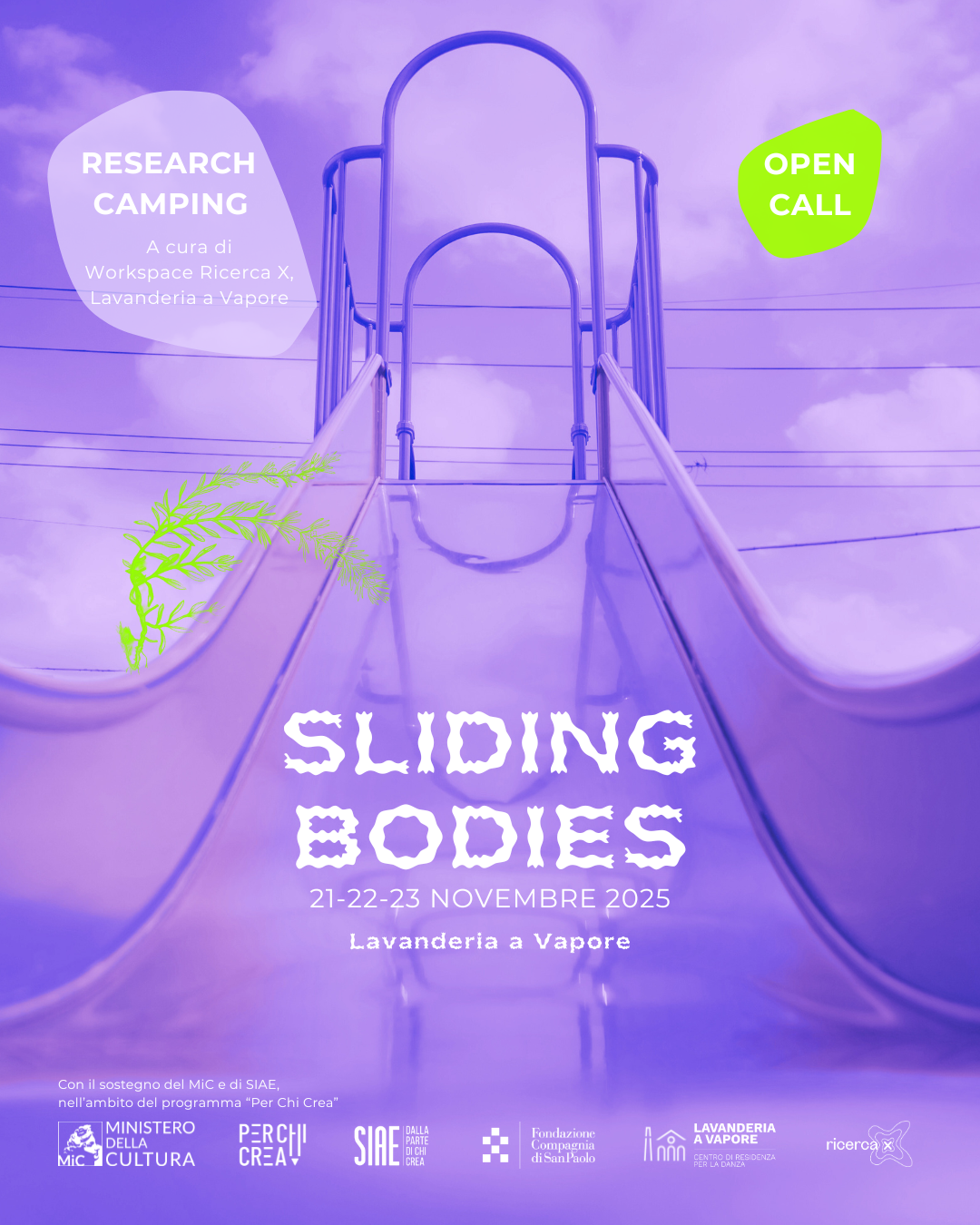 Dal 21 al 23 novembre 2025, torna il Research Camping per la sua quarta edizione, ideato da Workspace Ricerca X e Lavanderia a Vapore, trasformando gli spazi, dal foyer al teatro, in ambienti ibridi tra finzione e realtà, che diventano dispositivi per lo scambio e la disseminazione di processi di ricerca artistica. Il Camping non solo ospita ricerche ma si costituisce come una ricerca in sé protesa all’immaginazione di alternative sociali e politiche. Research Camping 2025 – Sliding Bodies indaga lo scivolare come postura e dinamica relazionale, come anatomia dell’interdipendenza, articolando tematicamente l’inclinazione verso ciò che è altro, non familiare, la circolarità della condivisione e il fallimento, scivolone per eccellenza, come poteri privilegiati per riscrivere simbolicamente un mondo nuovo che ripesca nel vecchio, nelle radici di uno stare insieme e di economie antiche.